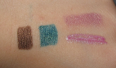 Left side is the pearlglide eyeliners: Lord It Up, Blackline and Black Swan. Next to them is the swatch of Moonlight Night pigment. Again, pretty but needs a base or to be used wet. I see the idea... may get a sample of it. The pink is Her Blooming Cheek blush; pretty but I already had Sleek Flamingo coming to me which is a hot pink as well.